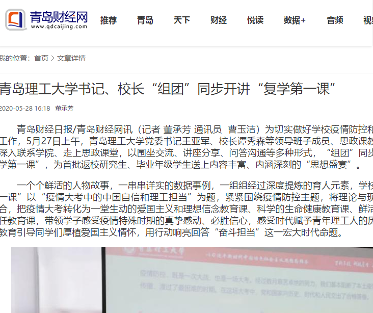 校党委副书记李国华、杨兴昌,副校长于德湖、王在泉、王伟,党委常委、组织部部长郭建锋,党委常委、统战部部长王维,思政课教师陈国庆、华章琳、任颖卮、李龙强,分别在市北校区、黄岛校区,为环境与市政工程学院、信息与控制工程学院、土木工程学院、理学院、管理工程学院、艺术与设计学院、人文与外国语学院、商学院学生同步开讲“复学第一课”。