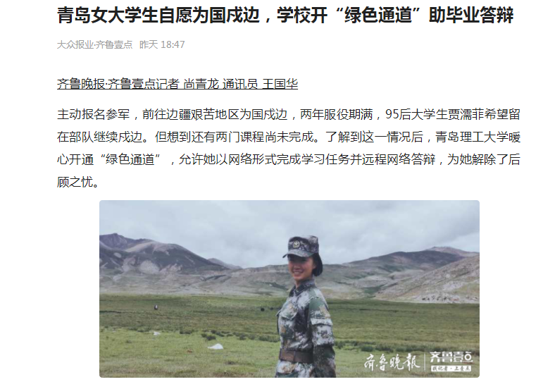 学校武装部在对服役大学生开展跟踪服务时,了解到这一情况,第一时间与教务处、人文与外国语学院沟通协调,特别为贾濡菲开通了“绿色通道”,允许她以网络形式完成学习任务并远程答辩。期间,部队专程联系学校,充分肯定了贾濡菲在部队的优异表现,并表示正考虑让其继续留队服役,感谢学校协助她解决了学业问题,让她能够安心为国戍边。