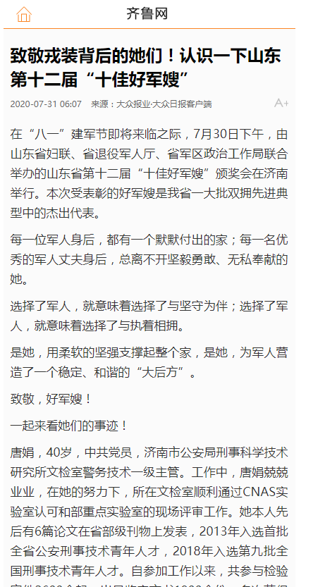在“八一”建军节即将来临之际,7月30日下午,由山东省妇联、省退役军人厅、省军区政治工作局联合举办的山东省第十二届“十佳好军嫂”颁奖会在济南举行。本次受表彰的好军嫂是我省一大批双拥先进典型中的杰出代表。