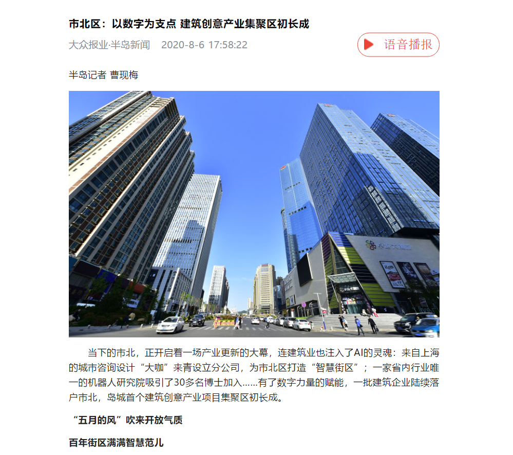 当下的市北,正开启着一场产业更新的大幕,连建筑业也注入了AI的灵魂:来自上海的城市咨询设计“大咖”来青设立分公司,为市北区打造“智慧街区”;一家省内行业唯一的机器人研究院吸引了30多名博士加入……有了数字力量的赋能,一批建筑企业陆续落户市北,岛城首个建筑创意产业项目集聚区初长成。