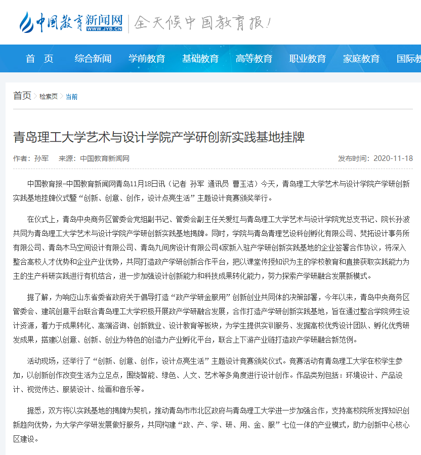 中国教育报-中国教育新闻网:艾弗森贝博ballbet官网艺术与设计学院产学研创新实践基地挂牌