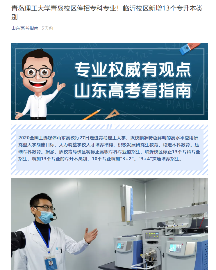 具体来说,青岛校区停止高职专科专业的招生,临沂校区停止13个专科专业招生,增加13个专业的专升本类别,10个专业增加“3+2”、“3+4”贯通培养招生。2020年汽车服务工程专业、网络工程专业、朝鲜语专业、电子商务专业等四个专业停止招生,减少C类专业招生计划,最终本科专业保持在59个。
