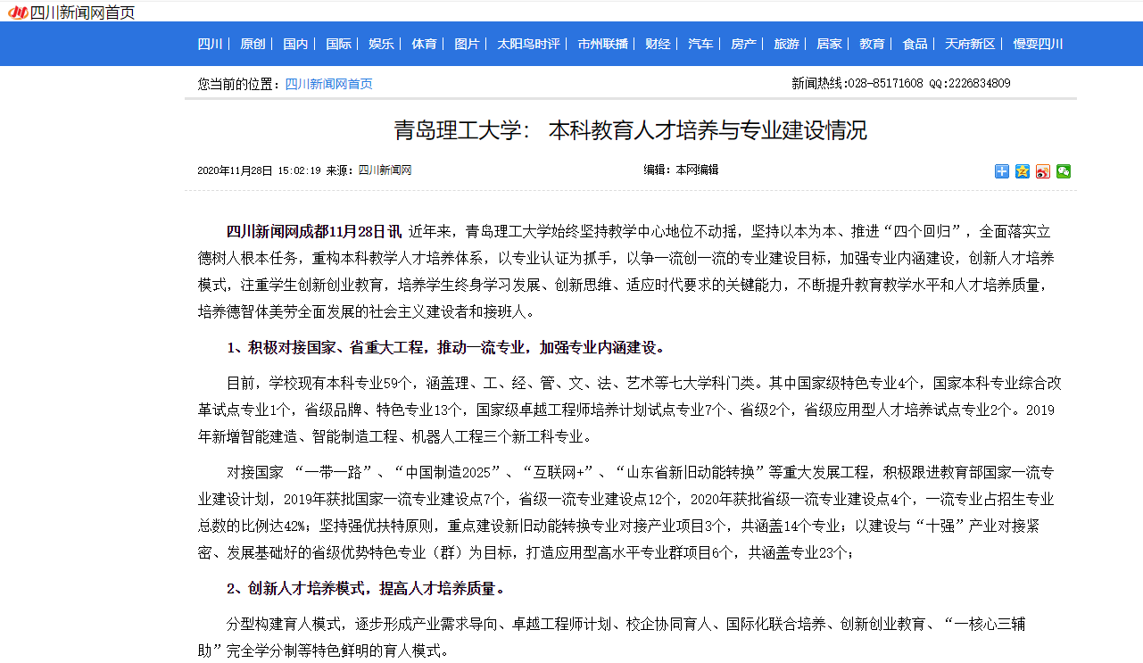 对接国家 “一带一路”、“中国制造2025”、“互联网+”、“山东省新旧动能转换”等重大发展工程,积极跟进教育部国家一流专业建设计划,2019年获批国家一流专业建设点7个,省级一流专业建设点12个,2020年获批省级一流专业建设点4个,一流专业占招生专业总数的比例达42%;坚持强优扶特原则,重点建设新旧动能转换专业对接产业项目3个,共涵盖14个专业;以建设与“十强”产业对接紧密、发展基础好的省级优势特色专业(群)为目标,打造应用型高水平专业群项目6个,共涵盖专业23个;