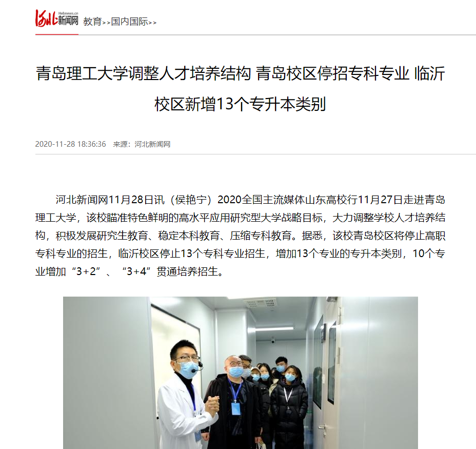 河北新闻网11月28日讯(侯艳宁)2020全国主流媒体山东高校行11月27日走进艾弗森贝博ballbet官网,该校瞄准特色鲜明的高水平应用研究型大学战略目标,大力调整学校人才培养结构,积极发展研究生教育、稳定本科教育、压缩专科教育。据悉,该校青岛校区将停止高职专科专业的招生,临沂校区停止13个专科专业招生,增加13个专业的专升本类别,10个专业增加“3+2”、“3+4”贯通培养招生。