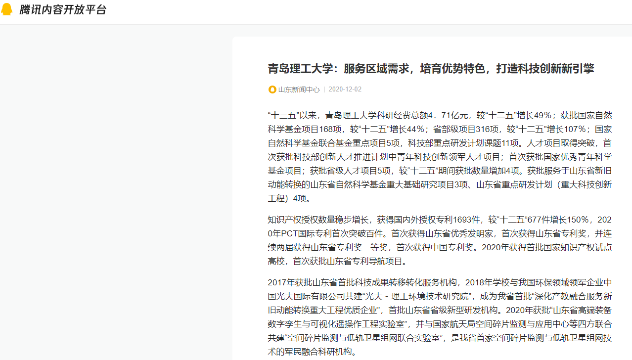 学校坚持“立足青岛、服务山东、面向全国”,着力探索校企、校地合作新模式,加快推进科教产融合,打造“区域特色+学科优势”科技创新“双引擎”,赋能科研高质量发展,为区域经济社会建设提供更多的智力、人力和技术支持。