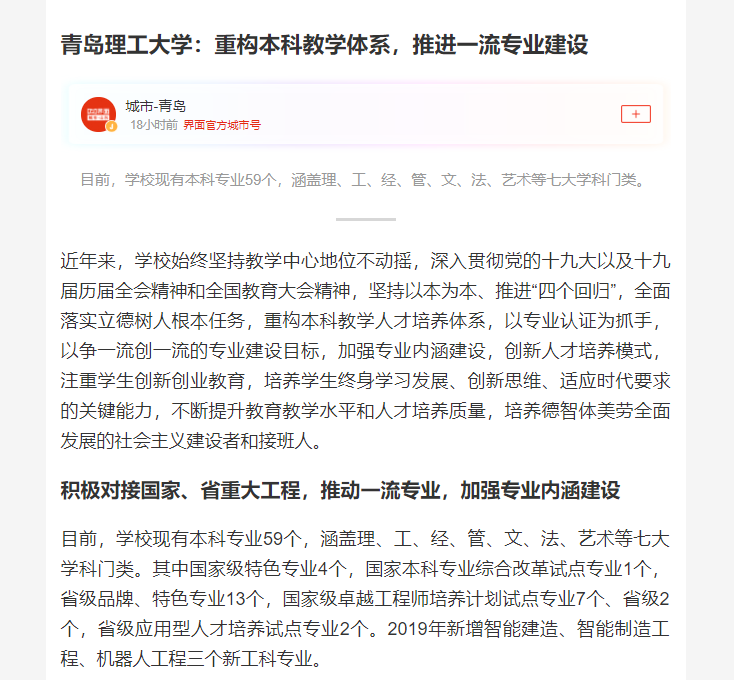 对接国家 “一带一路”“中国制造2025”“互联网+”“山东省新旧动能转换”等重大发展工程,积极跟进教育部国家一流专业建设计划,2019年获批国家一流专业建设点7个,省级一流专业建设点12个,2020年获批省级一流专业建设点4个,一流专业占招生专业总数的比例达42%;坚持强优扶特原则,重点建设新旧动能转换专业对接产业项目3个,共涵盖14个专业;以建设与“十强”产业对接紧密、发展基础好的省级优势特色专业(群)为目标,打造应用型高水平专业群项目6个,共涵盖专业23个。