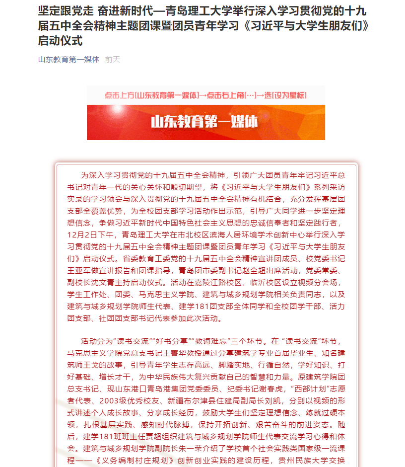 为深入学习贯彻党的十九届五中全会精神,引领广大团员青年牢记习近平总书记对青年一代的关心关怀和殷切期望,将《习近平与大学生朋友们》系列采访实录的学习领会与深入贯彻党的十九届五中全会精神有机结合,充分发挥基层团支部全覆盖优势,为全校团支部学习活动作出示范,引导广大同学进一步坚定理想信念,争做习近平新时代中国特色社会主义思想的忠诚信奉者和坚定践行者,12月2日下午,艾弗森贝博ballbet官网在市北校区滨海人居环境学术创新中心举行深入学习贯彻党的十九届五中全会精神主题团课暨团员青年学习《习近平与大学生朋友们》启动仪式。省委教育工委党的十九届五中全会精神宣讲团成员、校党委书记王亚军做宣讲报告和团课指导,青岛团市委副书记赵全超出席活动,党委常委、副校长沈文青主持启动仪式。活动在嘉陵江路校区、临沂校区设立视频分会场,学生工作处、团委、马克思主义学院、建筑与城乡规划学院相关负责同志,以及建筑与城乡规划学院师生代表、建学181团支部全体同学和全校团学干部、活力团支部、社团团支部书记代表参加此次活动。