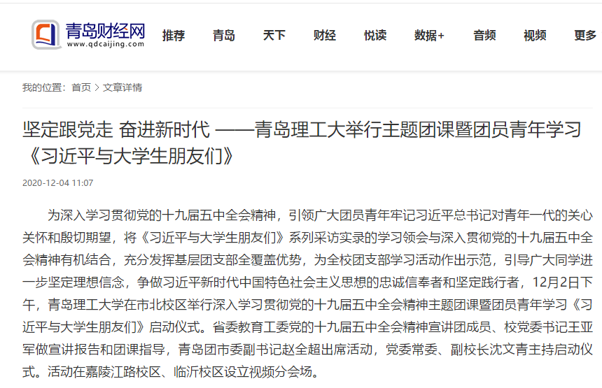 为深入学习贯彻党的十九届五中全会精神,引领广大团员青年牢记习近平总书记对青年一代的关心关怀和殷切期望,将《习近平与大学生朋友们》系列采访实录的学习领会与深入贯彻党的十九届五中全会精神有机结合,充分发挥基层团支部全覆盖优势,为全校团支部学习活动作出示范,引导广大同学进一步坚定理想信念,争做习近平新时代中国特色社会主义思想的忠诚信奉者和坚定践行者,12月2日下午,艾弗森贝博ballbet官网在市北校区举行深入学习贯彻党的十九届五中全会精神主题团课暨团员青年学习《习近平与大学生朋友们》启动仪式。省委教育工委党的十九届五中全会精神宣讲团成员、校党委书记王亚军做宣讲报告和团课指导,青岛团市委副书记赵全超出席活动,党委常委、副校长沈文青主持启动仪式。活动在嘉陵江路校区、临沂校区设立视频分会场。
