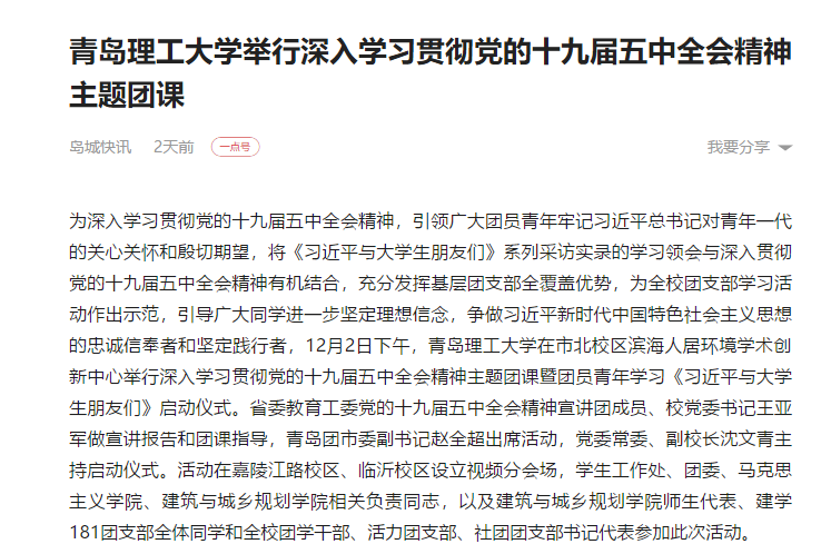 为深入学习贯彻党的十九届五中全会精神,引领广大团员青年牢记习近平总书记对青年一代的关心关怀和殷切期望,将《习近平与大学生朋友们》系列采访实录的学习领会与深入贯彻党的十九届五中全会精神有机结合,充分发挥基层团支部全覆盖优势,为全校团支部学习活动作出示范,引导广大同学进一步坚定理想信念,争做习近平新时代中国特色社会主义思想的忠诚信奉者和坚定践行者,12月2日下午,艾弗森贝博ballbet官网在市北校区滨海人居环境学术创新中心举行深入学习贯彻党的十九届五中全会精神主题团课暨团员青年学习《习近平与大学生朋友们》启动仪式。省委教育工委党的十九届五中全会精神宣讲团成员、校党委书记王亚军做宣讲报告和团课指导,青岛团市委副书记赵全超出席活动,党委常委、副校长沈文青主持启动仪式。活动在嘉陵江路校区、临沂校区设立视频分会场,学生工作处、团委、马克思主义学院、建筑与城乡规划学院相关负责同志,以及建筑与城乡规划学院师生代表、建学181团支部全体同学和全校团学干部、活力团支部、社团团支部书记代表参加此次活动。