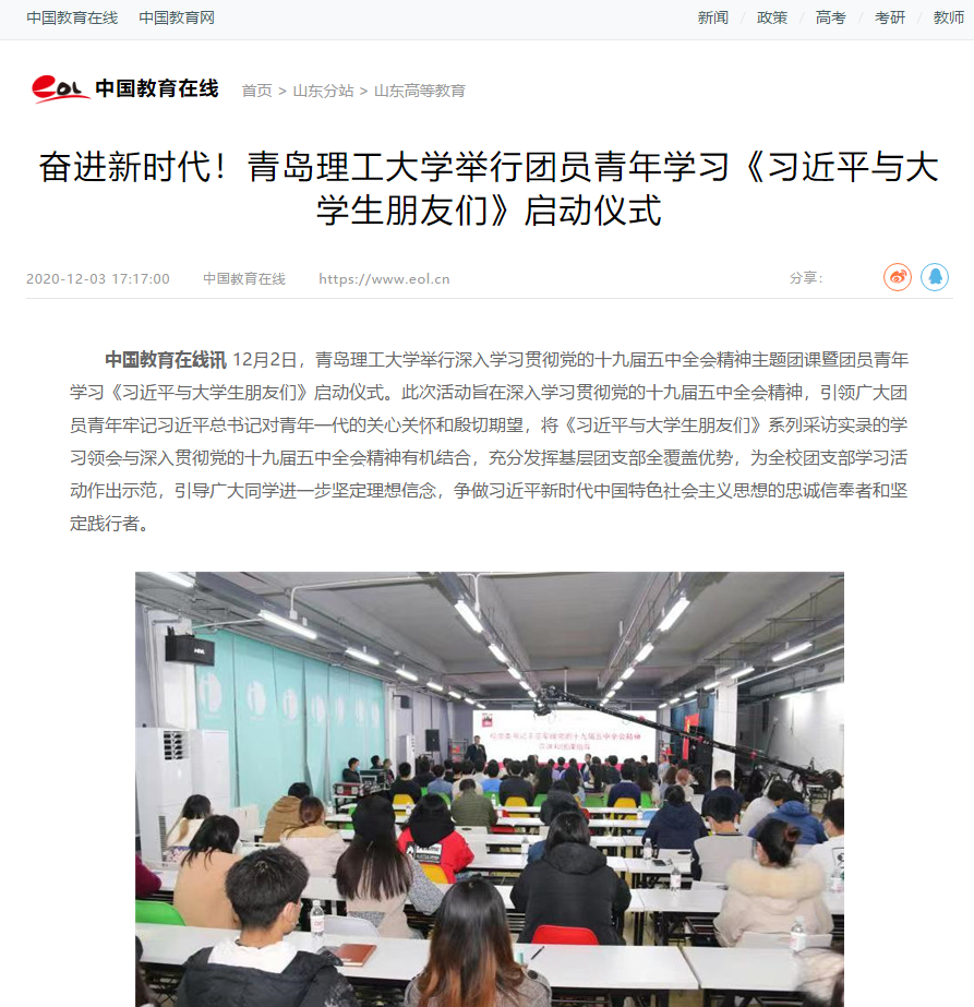 中国教育在线讯12月2日,艾弗森贝博ballbet官网举行深入学习贯彻党的十九届五中全会精神主题团课暨团员青年学习《习近平与大学生朋友们》启动仪式。此次活动旨在深入学习贯彻党的十九届五中全会精神,引领广大团员青年牢记习近平总书记对青年一代的关心关怀和殷切期望,将《习近平与大学生朋友们》系列采访实录的学习领会与深入贯彻党的十九届五中全会精神有机结合,充分发挥基层团支部全覆盖优势,为全校团支部学习活动作出示范,引导广大同学进一步坚定理想信念,争做习近平新时代中国特色社会主义思想的忠诚信奉者和坚定践行者。