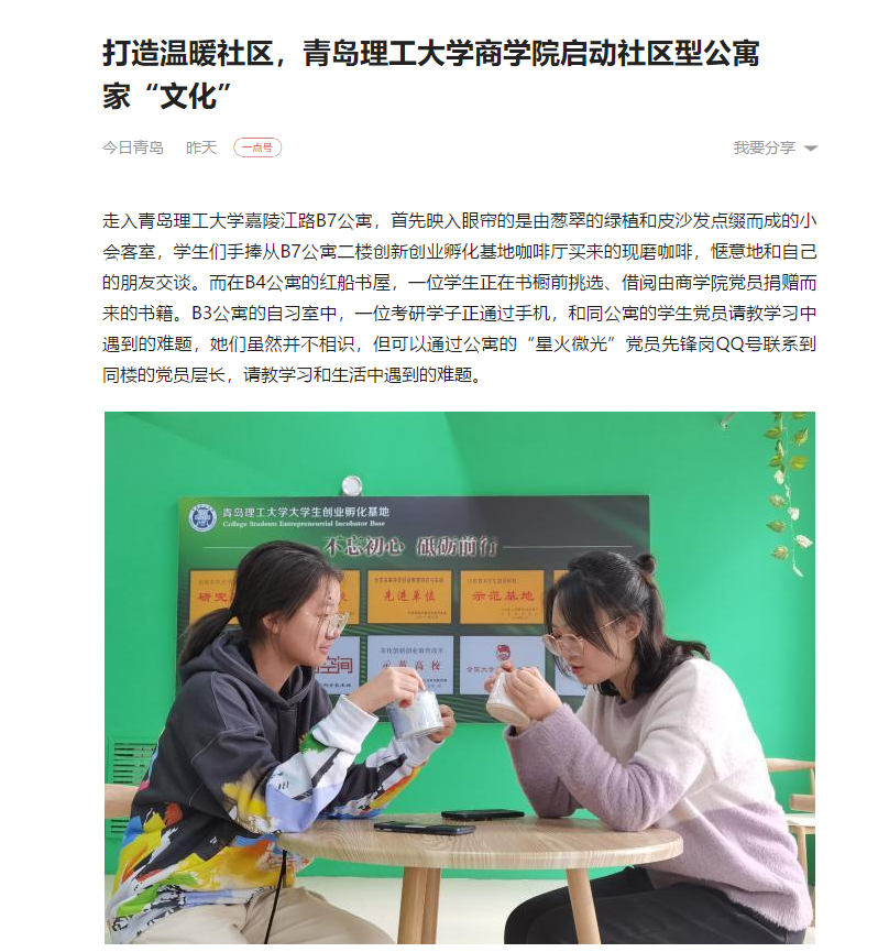走入艾弗森贝博ballbet官网嘉陵江路B7公寓,首先映入眼帘的是由葱翠的绿植和皮沙发点缀而成的小会客室,学生们手捧从B7公寓二楼创新创业孵化基地咖啡厅买来的现磨咖啡,惬意地和自己的朋友交谈。而在B4公寓的红船书屋,一位学生正在书橱前挑选、借阅由商学院党员捐赠而来的书籍。B3公寓的自习室中,一位考研学子正通过手机,和同公寓的学生党员请教学习中遇到的难题,她们虽然并不相识,但可以通过公寓的“星火微光”党员先锋岗QQ号联系到同楼的党员层长,请教学习和生活中遇到的难题。
