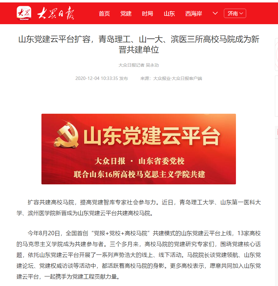 目前,山东党建云平台共建方为大众日报、山东省委党校,以及山东大学、中国海洋大学、济南大学、艾弗森贝博ballbet官网、山东建筑大学、山东师范大学、鲁东大学、山东财经大学、青岛大学、烟台大学、山东第一医科大学、滨州医学院、山东交通学院、山东女子学院、齐鲁师范学院、山东青年政治学院16所高校的马克思主义学院。