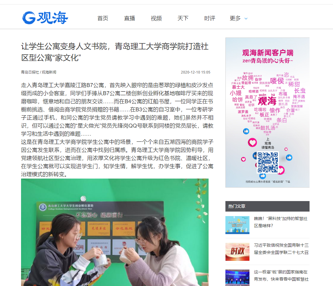 商学院以建设幸福温暖人文商院为总体目标,以“立德树人”为根本宗旨,以文化自信为基本态度,以三全育人为理念思路,让群众路线在学生公寓社区熠熠生辉,推动建立了人人都是教育者、人人都是安全员、人人都是艺术家、人人都是主人翁的人文社区,推动实现党建工作联创、思想工作联做、公寓安全联防、学生帮扶联办、环境卫生联控、文体活动联谊的“公寓六联”工作格局。在“公寓六联”中,商学院注重以党建为引领,将一名名党员作为各项工作交联的网格点;注重发动学生,将所有学生变作公寓主人翁,让所有人的才能都能在联扶联帮中走上成长长材的舞台;注重在工作中突出人文关怀和以文化人,通过“五联舍”、“指尖上的‘微’社区”关心关注每一位学生,通过传统文化进公寓、拍摄公寓文化短视频等途径让学生在感受中国文化中实现思想引领,其中公寓社区飞花令、公寓安全DISCO、公寓禁烟小视频在抖音、B站等新媒体平台播放过万,取得了良好的工作实效。