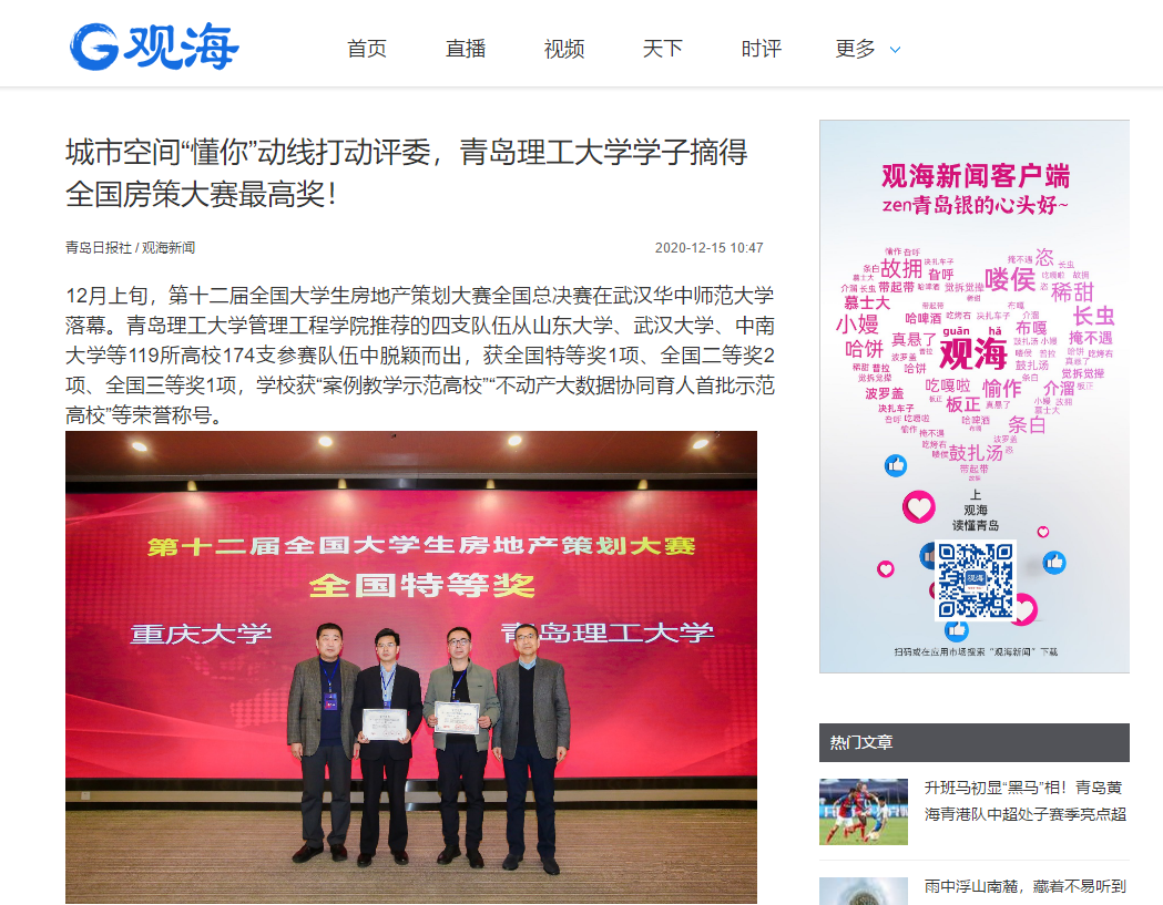 连续三年派队参赛,整合校内外资源,管理工程学院房地产教研室对比赛全程跟踪,结合专业和学生特点深入研究。2020年,全校范围内动员参赛,房地产、工程管理、工程造价、财务管理、市场营销、建筑学、土木工程等多专业、多学院参与,335名学生报名,创下校内参赛学院数量和学生数量之最。从多次校内线上培训、线下带队踩盘到校内赛初赛、校内赛决赛,管理工程学院还邀请了易居青岛分公司、克而瑞青岛、戴德梁行青岛分行、瑞源集团等企业的行业评委进行全程指导,为人才培养与行业发展献策献力。