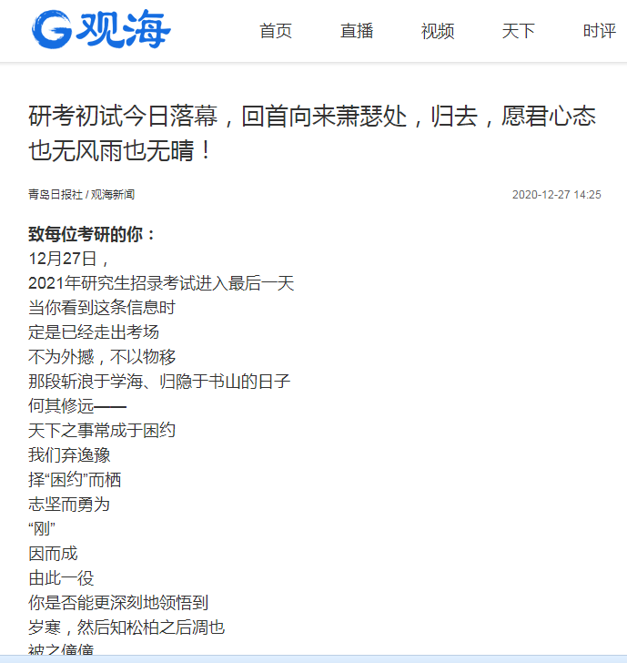 “考研就像在黑屋子里洗衣服,你不知道洗干净了没有,只能一遍一遍去洗。等上了考场的那一刻,灯亮了,你发现有的人忘了加洗衣粉,有的人用的是洗衣机。但只要你认真洗过了每一个地方,那件衣服一定是光亮如新的,而你以后每次穿这件衣服时都会想起这段岁月。”