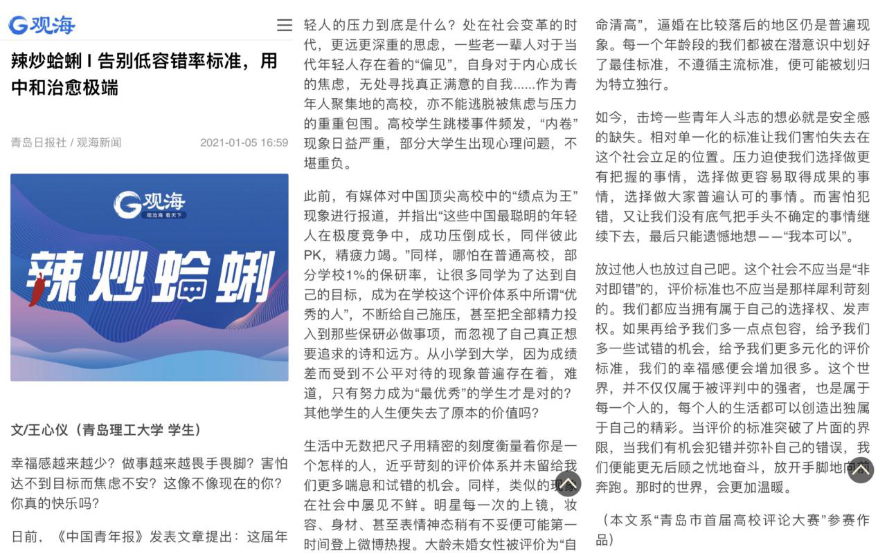 1月5日,《观海新闻》发表艾弗森贝博ballbet官网商学院学生王心仪文章《告别低容错率标准,用中和治愈极端》(文章系“青岛市首届高校评论大赛”参赛作品)。
