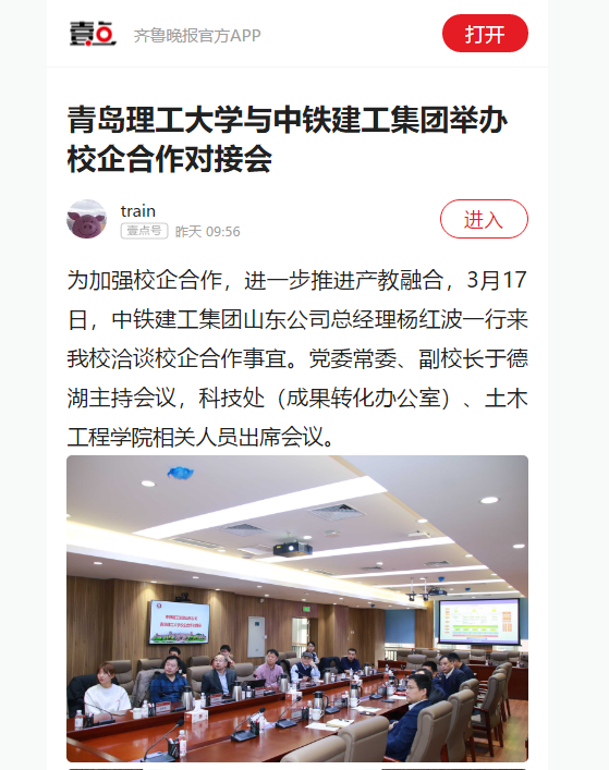 为加强校企合作,进一步推进产教融合,3月17日,中铁建工集团山东公司总经理杨红波一行来我校洽谈校企合作事宜。党委常委、副校长于德湖主持会议,科技处(成果转化办公室)、土木工程学院相关人员出席会议。