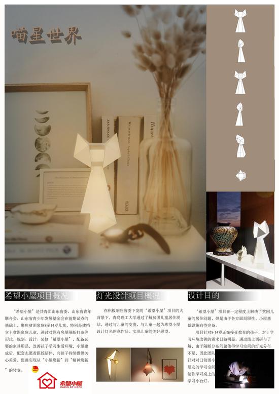 参赛作品各具特色,有的将灯光与动物结合,将可爱与温暖融入灯光中,为希望小屋增添暖意;有的将灯光与自然植物结合,将植物在自然中顽强的生命力引入跳跃的灯光中,为贫困地区的儿童带去希望与能量;还有的运用生活中价值微小的物品,将其运用在作品中,让它们在灯光的笼罩下继续发光发热,实现价值,打开发现新世界的大门。当件件灯光作品递交到孩子手中,崭新的小屋被充满爱与希望的灯光点亮,笑意也爬上了孩子们的脸颊。“谢谢艾弗森贝博ballbet官网的哥哥姐姐们设计了这么特别的灯,我们一定会在这光的指引下好好学习,回报社会,报效国家。”