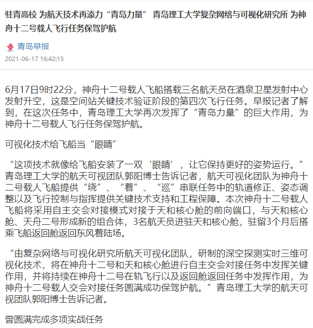 据了解,复杂网络与可视化研究所航天可视化团队已经成功为国家载人航天工程天宫一号与神舟八号、神舟九号、神舟十号交会对接任务,天宫二号与神舟十一号、天舟一号交会对接任务提供关键技术支持和工程保障;参与并圆满完成多项探月工程以及深空探测等工程实战任务,主要包括探月工程嫦娥二号、嫦娥三号、嫦娥五号T1飞行试验器、嫦娥四号以及嫦娥五号任务的可视化飞行控制指挥与遥操作操控任务,天舟二号货运飞船与空间站天和核心舱自主交会对接任务以及天问一号火星探测任务。