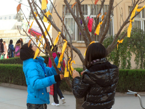 活动吸引了不少同学,同学们积极响应。活动是以写祝福的形式进行的:活动第一部分是同学们将自己对他人的祝福写在黄丝带上,然后将黄丝带系在校园的树上,黄丝带随风飘扬;活动第二部分是同学们将祝福写在便利贴上,然后贴在海报上,以海报展览的形式将同学们的祝福传递出去。