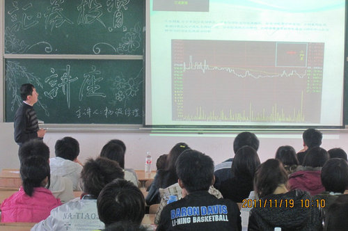 杨经理分别就盘面语言、基本面分析、投资理念三个方面向同学们介绍了证券投资的基础知识。讲座开始,他以生动形象的实例说明,只有一种理论是最简单、最具实用性、历史最悠久、适合范围最广并且经对得起市场考验的,这就是K线理论。接着,杨经理用全球的视野分析了目前的经济状况,并解释了这次经济危机的原因,拓宽了同学们的视野。杨经理提醒同学们在进行股票交易前应该具备一些条件,如渊博的知识、充足的资金、坚定的信念等。使同学们对股票投资有了新的认识。他说:“经济高速发展的今天,证券市场作为国家的晴雨表,能够更加清晰的折射出我国经济发展的总体状况。”最后杨经理总结了他对证券的认识,证券行业需要胆识但也要记住“股市有风险,入市需谨慎”。