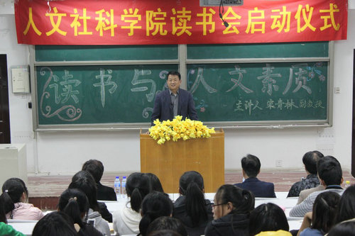 为更好地提高全院学生读书意识,丰富知识,增长见识,完善知识构架,促进专业融合,增强校园的人文氛围,渗透人文精神。10月28日晚,人文学院在二教阶301室举行了“阅读 快乐 丰富 提升”读书会启动仪式。人文学院院长谭业庭、党总支书记王众臣、副书记林桂梅、团总支书记刘聘,汉语言教研室主任宋青林以及全体学生干部、汉语言文学专业学生和“风雅读书社”社员参加了本次会议。大会由林桂梅副书记主持。