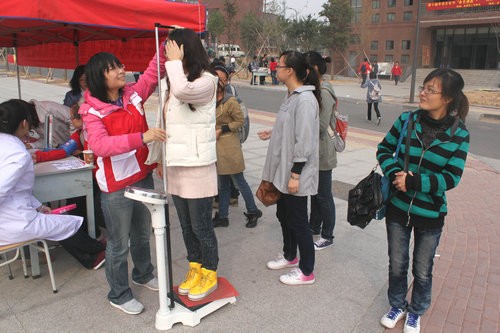 医院为同学们提供了身高体重测量、心内科检查、口腔科检查及妇科检查等项目,在持续一天的义诊活动中,很多同学认真的查完了这些项目并咨询了一些问题。义诊活动中,不断有物业及餐厅工作人员前来检查身体,医生也都针对他们的身体状况提出了建议。同时,社团为每位查体者免费提供了板蓝根、创可贴等药品,查体者纷纷表示感谢,认为此次活动的举办很有必要。