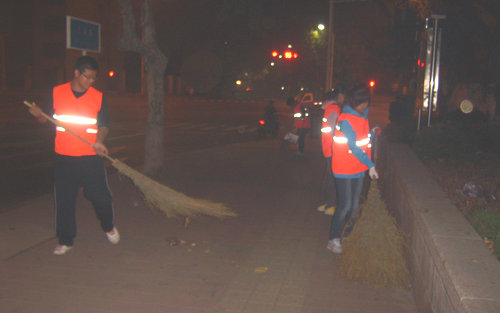 10月23日,凌晨4:30,在夜色笼罩下红十字志愿服务团的22名志愿者在北院门口集合完毕,在红团实践部部长带领下来到活动地点。志愿者穿好环卫工服分成三组,拿着扫帚、簸箕等清扫工具,由来自四方区环卫总公司的负责人带领,分别于山东路、南宁路、抚顺路开始了清扫。志愿者们分工合作,有的用大扫帚清扫垃圾,有的则用簸箕把垃圾装运到指定垃圾车上。活动期间还下了一阵小雨,这并没影响志愿者的热情,大家你扫我运,不怕脏不嫌累,与环卫工人并肩作战。活动持续一个半小时,临结束时,一位环卫老大爷还亲自向志愿者们表示了感谢。
