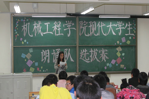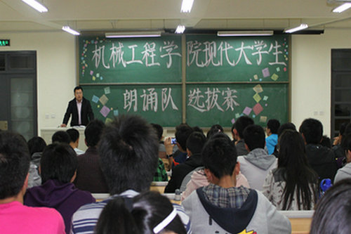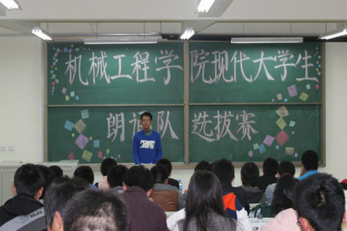 为丰富同学们的课余文化生活,发现和选拔朗诵人才,10月20日晚,由机械学院学生会主办,学生会编辑部承办的“现代大学生”朗诵队选拔赛在嘉陵江路校区主教学楼举行。学院代理团总支书记工作的化磊老师出席比赛并讲话,校学生会、大学生通讯社、广播站等部门负责人担任评委。