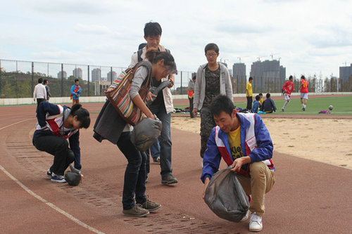 10月20日中午,红十字志愿服务团在嘉陵江路校区足球场及二餐厅门口举办“洁净校园——我们在行动”环保活动,社团所有成员参与了此次活动。