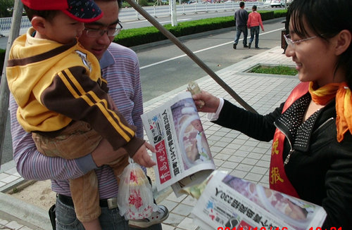 日前,由商学院学生社联爱心社联合青岛晚报社开展的微尘义卖报纸活动在开发区佳世客附近繁华地段进行,共有60余名同学参加了此次活动。
