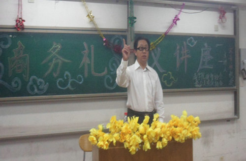 宋青林老师以一首激情四溢《渴望英雄》朗诵开场,而后就商务人文素质的如何提高与大家进行交流,并通过分析央视优秀主持人的成功事例对决定人才成功的三个要点做了讲解。最后,宋老师指出礼仪就在我们身边,时刻伴随我们,并着重介绍日常生活中的仪表风度礼仪﹑办公礼仪﹑介绍礼仪等,希望大家做一个优雅高贵、出类拔萃的人。