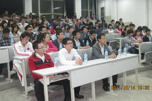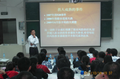 讲座开始,段经理以08年股市大跌到09年股市大调整入手,系统地介绍了股民的成长阶段并对同学们进行了股票投资风险教育。接着,他又分别概括了股民在初级、中级、成熟阶段的特征,还给同学们提出了两个问题,大家都积极踊跃地提出了自己的观点和见解,现场气氛活跃。之后,段经理联系香港特首民选、房地产供需拐点出现等国内政策和形势,对股市黄金十年作出了明白易懂的解释。自由提问阶段,同学们向段经理提出有关证券投资和规划大学生活等方面的问题,段经理幽默精彩的回答,赢得了同学们的阵阵掌声,将现场气氛引向了新的高潮。