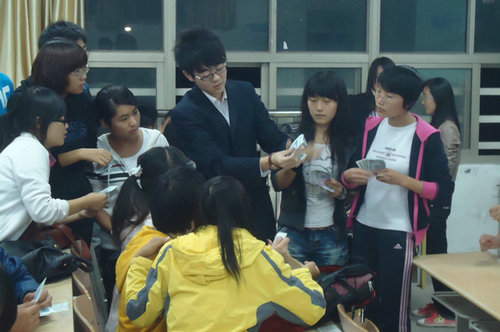 培训会开始后,主持人首先介绍了各参赛队伍。接下来郑经理介绍了本次比赛的意义,有益于培养财会专业学生的专业兴趣,并为同学们详细讲解了点钞的动作要领和正确姿势,并就点钞过程中容易出现的问题进行了重点说明。随后,同学们在领到练功券后,开始了积极认真的练习,郑经理和迟经理对选手逐一进行指导,最后,培训会在轻松而欢乐的气氛中结束。