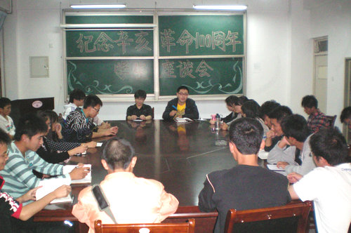 座谈会以“铭记历史,启迪未来”为主题。首先,同学们认真学习了胡锦涛总书记在纪念辛亥革命100周年大会上的重要讲话,并进行了讨论。胡锦涛的讲话明确了纪念辛亥革命的现实意义,传达了促进祖国统一、实现民族复兴的共同心声,使民众对祖国的美好未来充满信心。同时,同学们共同回顾了百年历史,并以史为鉴,从多个角度讨论了辛亥革命的成功原因、历史影响和现实意义。