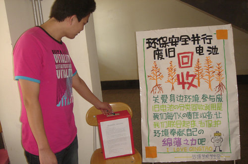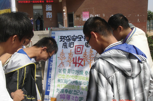环境学院通过每一位学生做‘低碳一族’”的倡议活动,向大家展示了更多的废旧电池随意乱扔的危害和正确的处理方法,并回收同学们不用的废旧电池和各种废旧的电子产品。首先,工作人员展示了目前“垃圾围城”、各类公害事件层出不穷的社会现状向同学们敲响警钟。之后着重介绍了废旧电子产品的随意乱扔,极易造成重金属渗入地下,污染泥土和水源。至此环保协会提出倡议,呼吁同学们将电池集中处理。受到启发的同学们纷纷响应号召,将自己的废电池扔进了工作人员事先准备好的收集箱中。