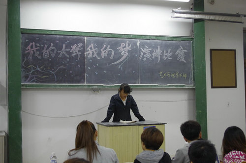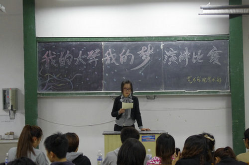 为丰富大一新生的课余生活,展示其青春风采,艺术学院于9月29日晚上在一教229举办了“我的大学我的梦“主题演讲比赛。