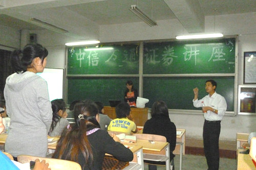 武庆林讲师首先对中信万通作了简单介绍。然后就如何考取证劵从业资格证书做详细的说明和建议,向大家述说了股票,基金,储蓄三者之间的区别及联系和以后证劵方面的就业方向。最后武庆林讲师又对以后在中信万通实习资格的获取给与建议和要求,就现场观众提出的不同问题给于了详细解答。
