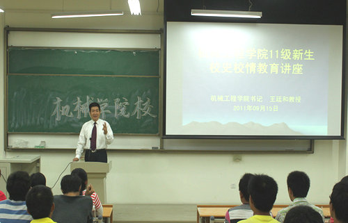 在讲座中,王廷和书记首先介绍了学校的发展历史,尤其是近年来以学校更名、成功申报博士点为代表所取得的重大成就。他指出,学校近十年来取得的成就,与学校领导坚持科学发展观,与全校师生员工以“百折不挠、刚毅厚重、勇承重载”的理工精神,实践着“严谨、勤奋、求实、创新”的校训是分不开的。接着,王书记讲述了机械学院科学发展,和谐发展与快速发展的历史沿革、各个时期各项工作取得的主要成果、学院求实创新等优良传统,以及学院目前现状。他详细向同学们介绍了学院的机构设置、历史沿革,专业和学科设置、师资队伍、重点学科实验室、特色专业、教学团队、精品课程、在校生规模、先进的教学设备、校外教学基地、就业基地、出版的教材著作、教改成果、科研项目、党群工作、大学生校园文化活动和科技创新活动以及毕业生就业等情况。