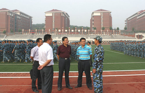 9月9日上午,机械学院党总支书记王廷和,副书记肖学斌,团总支书记贺治成,辅导员化磊和王中帅前往新校区足球场看望教官,慰问学院2011级新生。