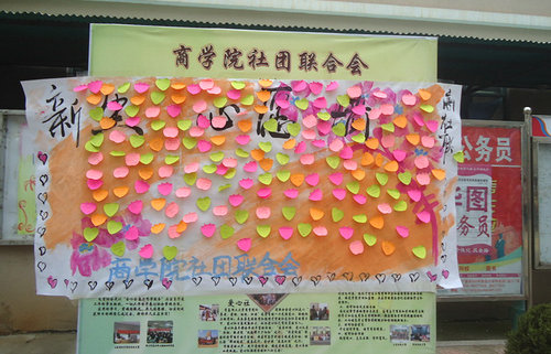 中午,当商学院社联将心愿墙的背景海报摆出后,有很多同学前来观看。当社联同学把此次活动的目的介绍给大家时,很多同学纷纷索要裁剪成心形的便签纸,在上面认真写下自己的大学愿望,一部分大二大三的同学也对大一新生寄语,告诉他们怎样度过大学生活和对新生的祝福,社联同学还邀请了军训的教官,在心愿墙上留下对新生的寄语。