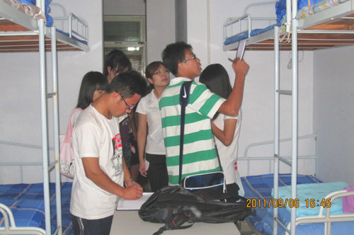 为使大一新生养成良好的生活习惯,创造舒适的休息环境。9月6日下午,经贸学院学生会生活部、纪检部与公寓团组织一起开展新生内务大比拼活动。2011级辅导员刘胜荣老师带领学生会成员与各班班助深入到宿舍内部,进行仔细的检查与评比。