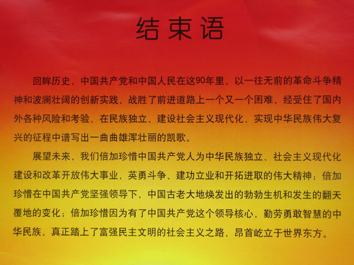 本次图片展详细而生动的再现了中国共产党自从1921年成立以来,为了求得民族独立和人民解放,实现国家繁荣富强和人民共同富裕,走过的九十年辉煌而艰辛的历程。展览共分三个部分,第一部分为艰辛探索,描述了自马克思主义传到中国,中国先进分子在黑暗中看到了曙光,在澎湃的无产阶级革命运动中成立了中国共产党。从此中国有了明确的革命纲领即反帝反封建,开始了义无反顾的伟大斗争。第二部分为创建伟业,经过28年的浴血奋战,中国共产党终于取得了新民主主义革命的伟大胜利,建立了中华人民共和国,而后成功完成了国民经济的恢复,完成了三大改造,顺利进行了第一个五年计划的经济建设。第三部分为扬帆启程,十一届三中全会以后党实现了伟大的转折,开拓了新局面。“三个代表”重要思想及科学发展观又带领各族人民谱写了新篇章。中国各方面突飞猛进,取得了举世瞩目的成就。