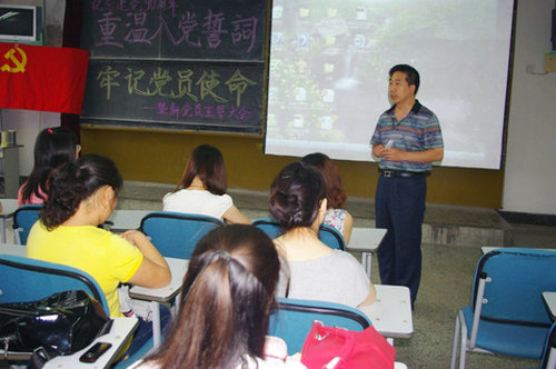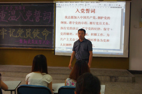 为庆祝中国共产党成立90周年,人文学院学生党支部于6月29日举行“重温入党誓词 牢记党员使命”暨新党员宣誓大会,支部书记刘聘、组织委员东忠方参加了本次大会。 大会在庄严的《国际歌》中拉开序幕,刘聘老师带领全体新党员庄严宣誓,全体新党员以铿锵有力的声音向党表达了自己为社会主义和共产主义奋斗终身的决心。随后学生党员观看学习了《胡锦涛总书记在清华大学百年校庆的重要讲话》精神,深刻体会了总书记对当代青年学生提出的希望和要求,随后各位党员对近期的学习、生活及工作进行了汇报和交流。他们回顾了党走过的伟大历程和取得的光辉业绩,围绕创先争优活动,就如何充分发挥学生党支部在各类学生组织中的核心作用,密切党组织与广大同学的联系,学生党员如何更好地提高党性修养、努力成长成才,并在同学中做好榜样表率等问题,谈了各自的感想与体会。 党员们表示时刻以高标准严格要求自己,在日常的工作、学习、生活中,积极发挥党员的模范带头作用,不断加强学习,努力提高政治思想素质,牢记使命,励志做一名优秀的共产党员。(人文学院)