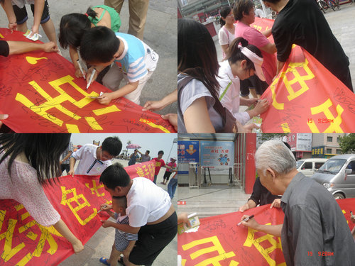 在香江路繁华的商业街、金沙滩旅游点等地,环境学子热情地向经过身边的人们发出低碳生活、绿色环保的倡议。活动中,七旬老人、学龄少年,形形色色的路人,纷纷主动在学生们准备的宣传横幅上工整地签上自己的名字。其间,很多路人在听了大学生对活动的解释和介绍后,都表示会从小事做起,少开一盏灯,多走几步路,建立良好的绿色生活主张或生活习惯。尽管天气炎热,参与到活动中的大学生们仍然激情饱满,大家都表示这次的大型宣传目的就是为了让更多市民意识到低碳生活的重要性,号召更多人加入低碳生活的队伍中。