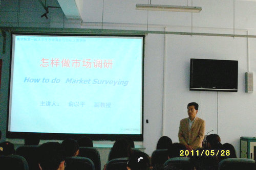 该次的讲座的主题是:怎样做市场调研。担任本次主讲的是商学院副教授俞以平,他就市场调研的概念、市场调研的类型、市场调研的程序、市场调研的误差、调研问卷回收的审核和市场调研的报告等方面做了详细的阐释。最后,他还与同学们进行了互动交流。