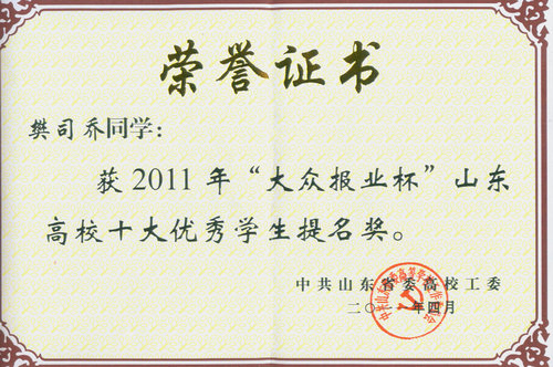 日前,在刚刚结束的2011年度山东省高校十大优秀学生的评选中,我校管理学院樊司乔同学荣获山东高校十大优秀学生提名奖。