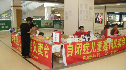 志愿者们把众多商家捐赠的产品以爱心价便宜甩卖转化成善款,同时在街头发放宣传单、设立募捐箱,呼吁大家关注关心自闭症儿童,献出一份关爱支持残疾人事业。