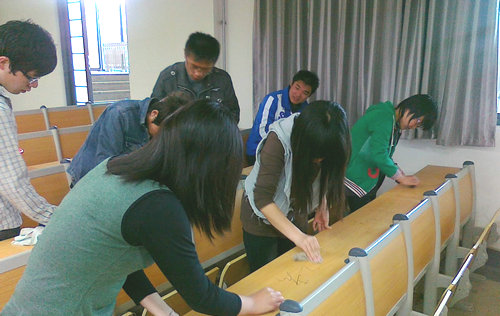 为响应机械学院的“我为团旗争光彩”系列主题活动,丰富团员生活,进一步弘扬在校大学生的奉献精神,展现当代团员的合作精神。5月7日早上,机械学院材料103班团支部全体同学到黄岛新校区教学楼清理课桌上的字迹。