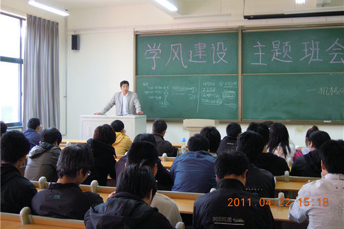 首先,化磊老师对目前年级学风建设的现状及存在的问题进行了分析总结,对机械095在上学期优良学风班评比中取得的优秀成绩表示赞扬,要求同学们以积极的态度投入学习,并对同学们的晨读、课堂出勤、晚自习等方面提出具体要求。黄晓兵老师对班级学风建设中存在的问题及班级下一步工作进行了部署。黄老师分析了目前大学生的就业形势,由于我国大学教育的普及,对大学生入学要求降低,大学生就业已经不是“包分配”而是学生与企业之间的双向选择。在一个就业难的时代,同学们只有积极学习以提高知识储备,才能应对现代就业竞争。